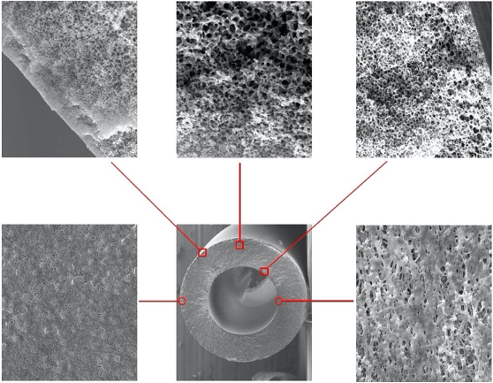 專有共混配方制備海綿體結構PVDF超濾膜,抗拉和抗壓強度大大提高,能更好地適用于污水或者廢水時的惡劣運行狀況和清洗條件。